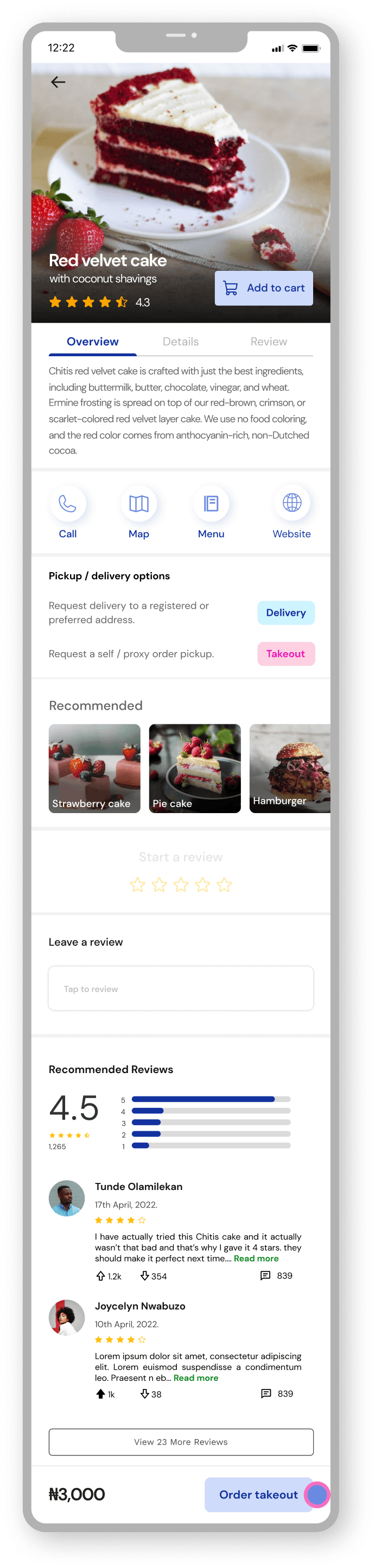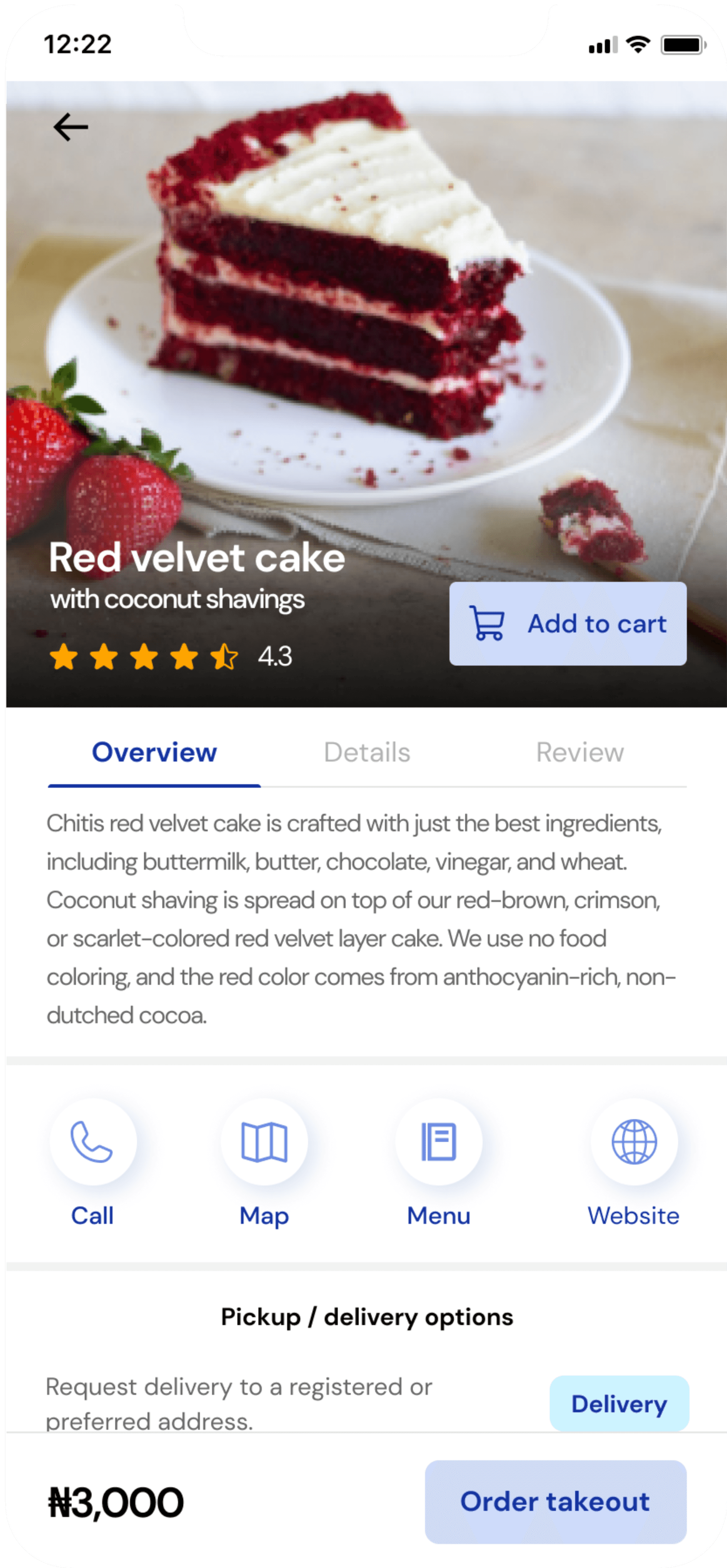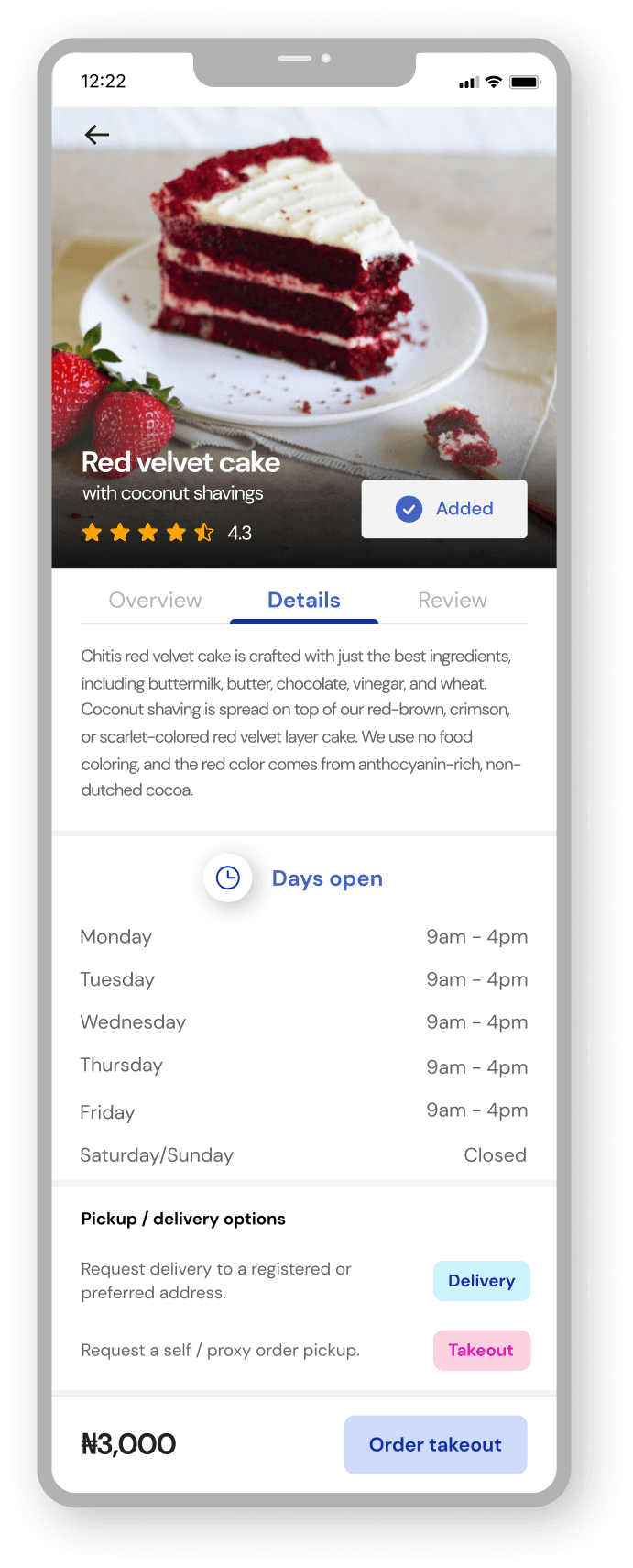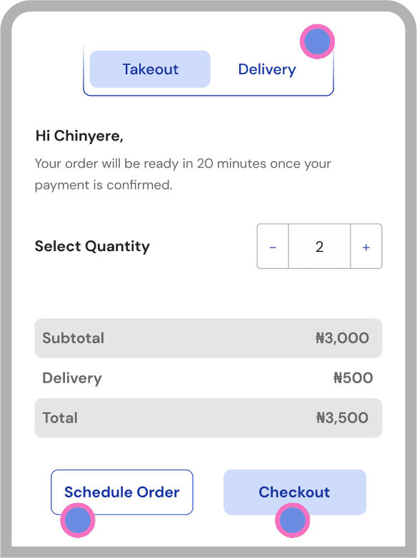 The ordering process is smooth and easy. The user is able to see more details about the highlighted product, choose between pickup or delivery, schedule orders, track order delivery in real time and make direct contact with the dispatch rider.