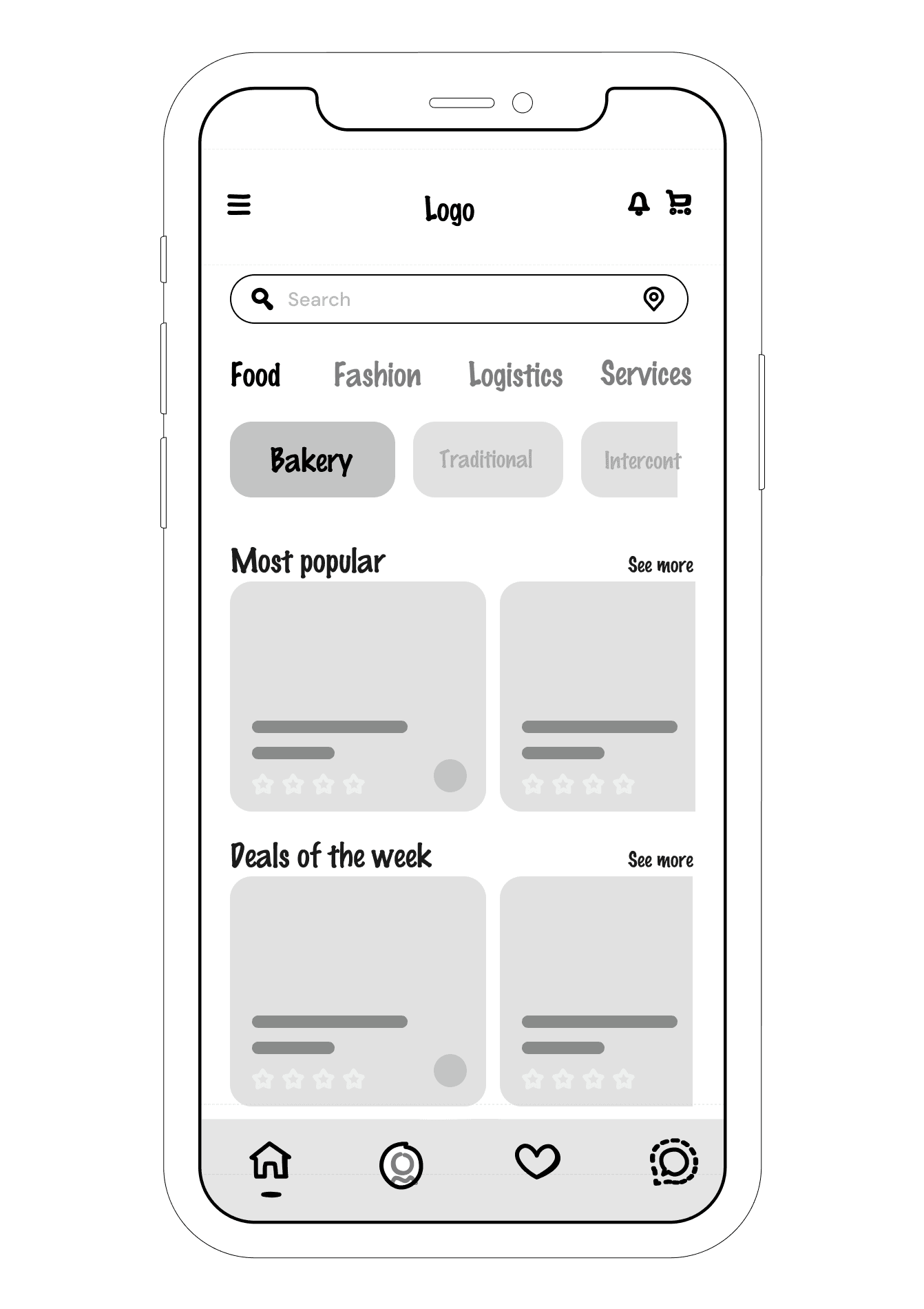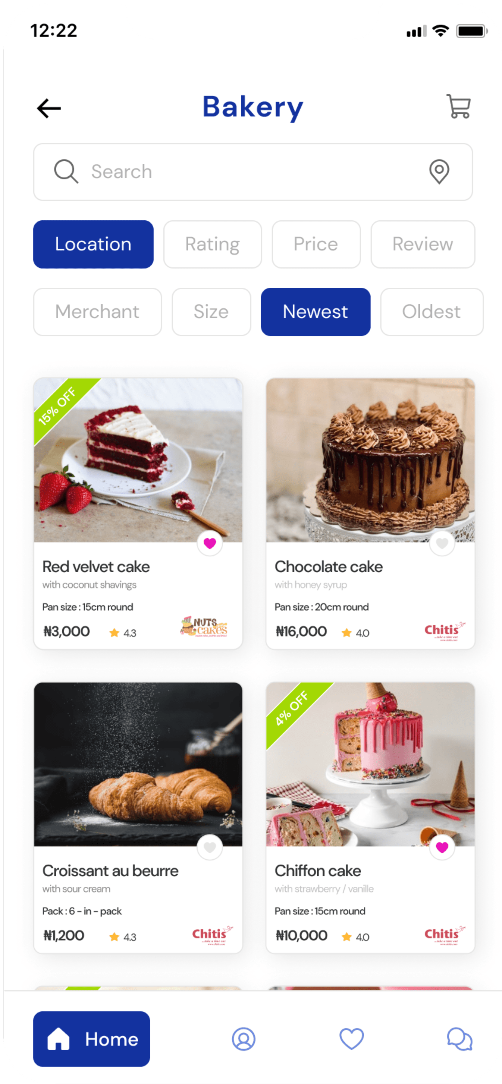 The home screen features products displayed by the merchants and shows brief details about each item. It features a custom search option for easier product or merchant searches based on geo - location or broader searches.